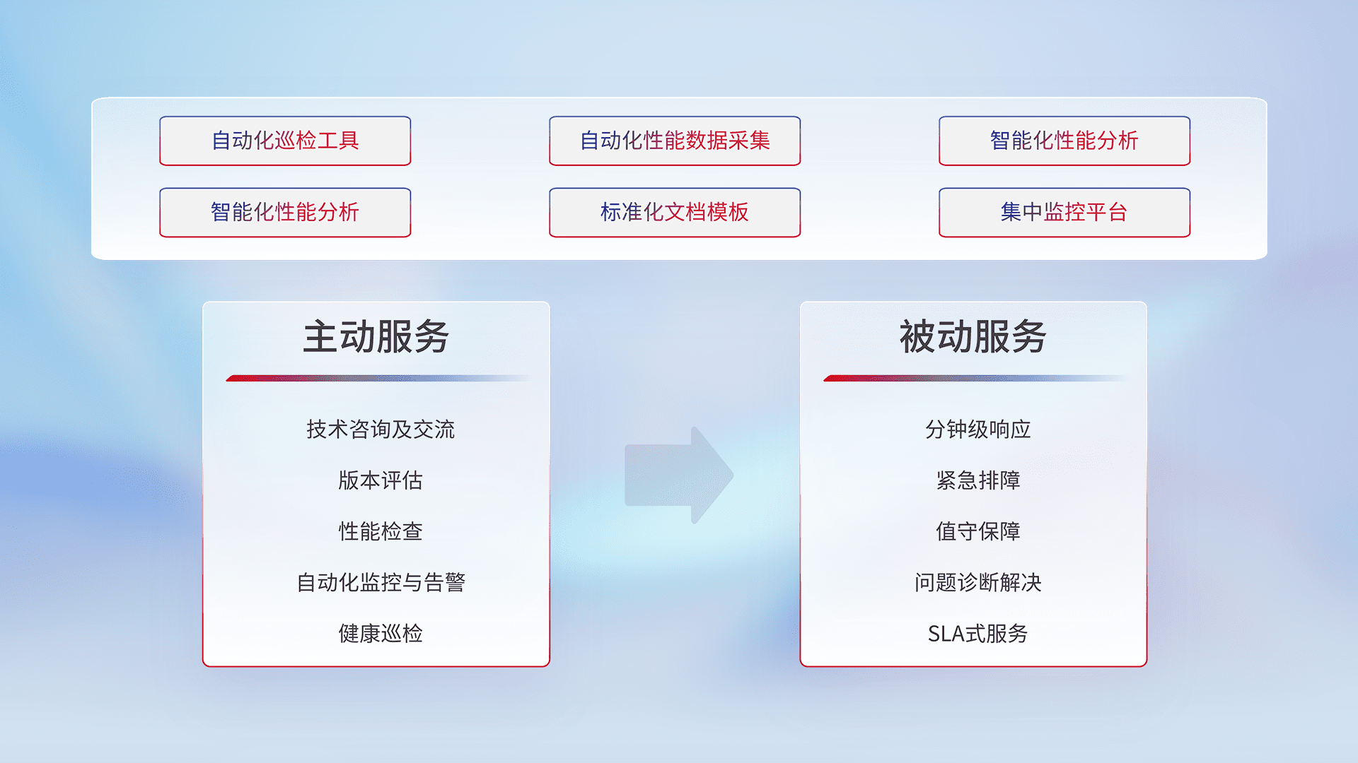 智能化工具和标准化文档,,保障服务质量,,提供主动服务(包含技术咨询、、、版本评估、、、性能检查、、自动化监控与告警、、、健康巡检)和被动服务包含(分钟级响应、、、、紧急排障、、值守保障、、、问题诊断解决、、、、SLA服务)。。。。