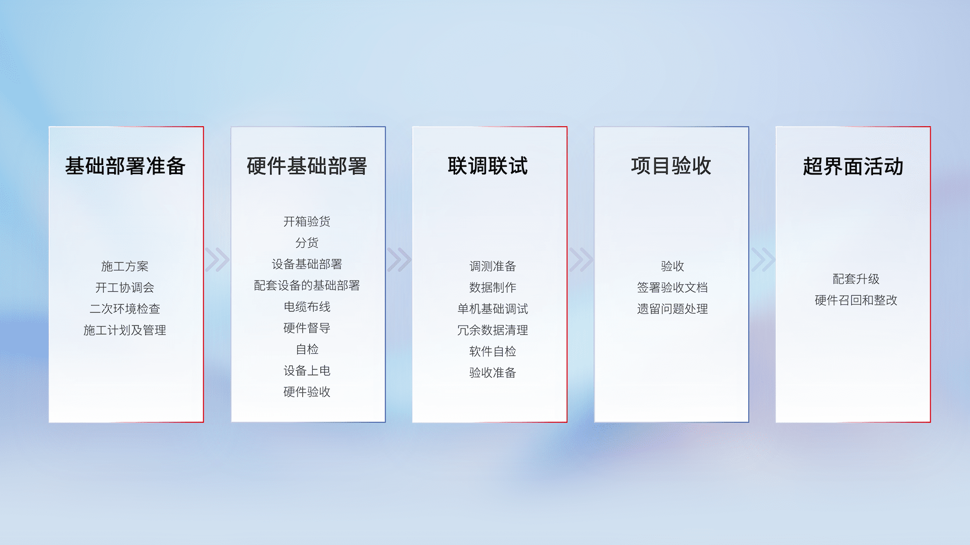 从基础部署准备、、硬件基础部署、、、、联调联试、、、项目验收、、、、越界面活动的全过程可追溯,,保证施工质量和进度。。。。